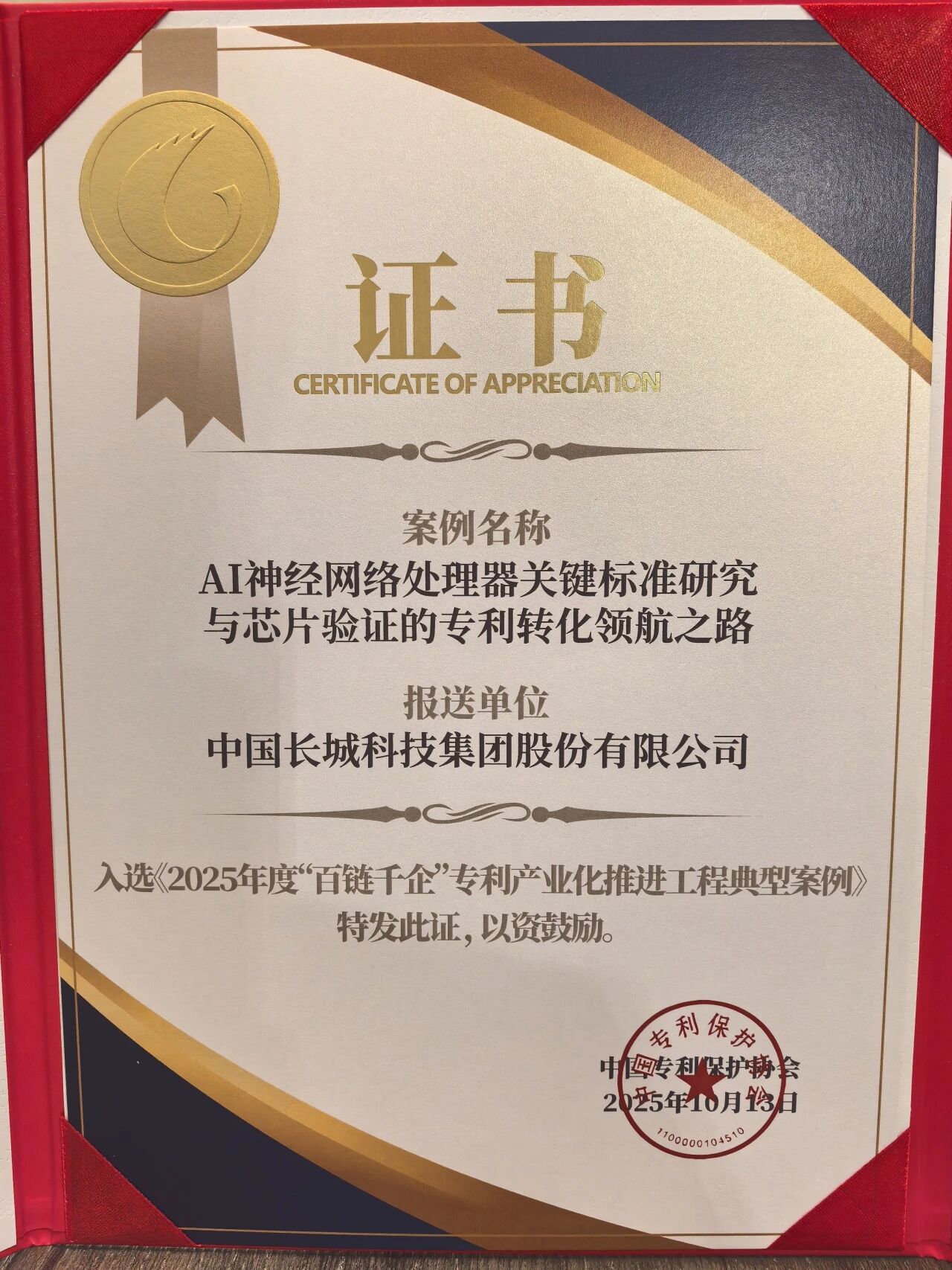 近日,中國(guó)專利保護(hù)協(xié)會(huì)公布了2025年度“百鏈千企”專利產(chǎn)業(yè)化推進(jìn)工程典型案例,中國(guó)長(zhǎng)城“AI神經(jīng)網(wǎng)絡(luò)處理器關(guān)鍵標(biāo)準(zhǔn)研究與芯片驗(yàn)證的專利轉(zhuǎn)化領(lǐng)航之路”成功入選,成為全國(guó)僅20項(xiàng)獲選案例之一。